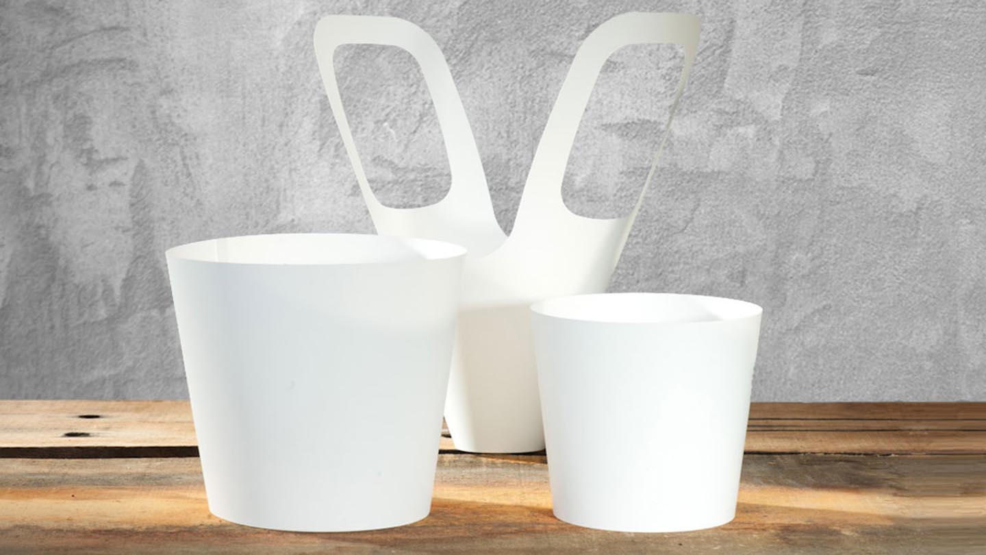 Materiale plastico 100% riciclabile e 50% riciclato. Perfetto per Pot Cover di formati più piccoli. Chiusura a uncino. Alta durata