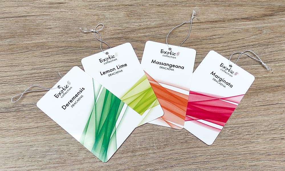 Design e produzione di etichette a pendaglio per la collezione di piante da interno Pure O2 del marchio spagnolo CQ Plants.