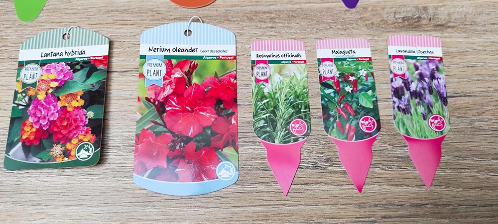 Diseño y fabricación de una amplia colección de etiquetas para plantas hortícolas y ornamentales para la empresa portuguesa Viveiros Monterosa. Se emplean diversos sistemas de sujección de la etiqueta en función del tipo de planta para se muestre de forma adecuada en el punto de venta: colgada, fijada a la maceta o clavada.
